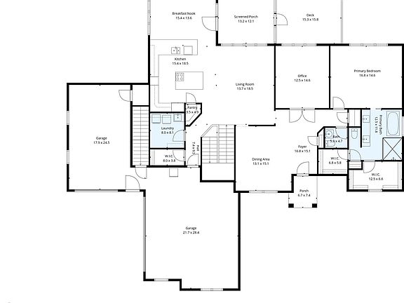 Also located on the main level are a large office with French doors, main-level laundry and a powder room.