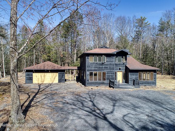 Nestled on 10.6 private acres at the end of a quiet cul-de-sac, this custom-built contemporary home offers a rare blend of privacy, space, and modern comfort, highlighted by charming Arts & Crafts details. This spacious 4-bedroom, 2.5-bath home features stunning handcrafted cherry woodwork in the kitchen and stairway, beautifully complemented by gorgeous hardwood floors throughout. A skylit foyer enhances the home's bright, welcoming atmosphere, setting the tone for the natural sunlight that pours into every room. The open-concept main level includes a dining area, a cozy living room with fireplace, and a well-appointed kitchen—perfect for both entertaining and everyday living. The kitchen serves as the heart of the home with abundant cabinet storage, a breakfast bar, and stainless steel appliances. The first-floor primary bedroom offers easy, convenient living, complete with a spa-like marble bath, standing shower, and vanity. Step outside to enjoy the breezy screened-in porch or unwind on the upper and lower decks—ideal for quiet relaxation. A scenic path leads to a 10-foot-deep pond, offering a peaceful natural escape. The property also includes an oversized detached garage, perfect for one car and storing outdoor gear or toys. Just minutes from Woodstock's vibrant restaurants, local shops, hiking trails, and more, this home offers the perfect combination of craftsmanship, comfort, and convenience in a truly private setting. Come take a look! Please note: A separate lot is included in the total acreage and taxes. Also known as SBL 27.4-3-35.700. Recent updates include a freshly painted exterior, new carpeting in the upstairs bedrooms, and refinished hardwood floors throughout. ** ACCEPTEED OFFER AS OF 7/29/2025 **