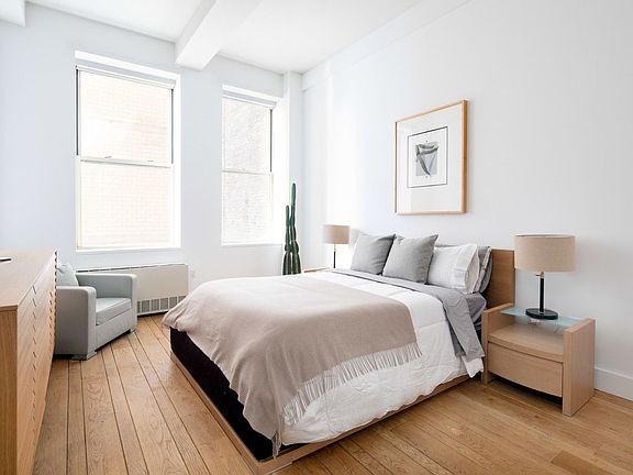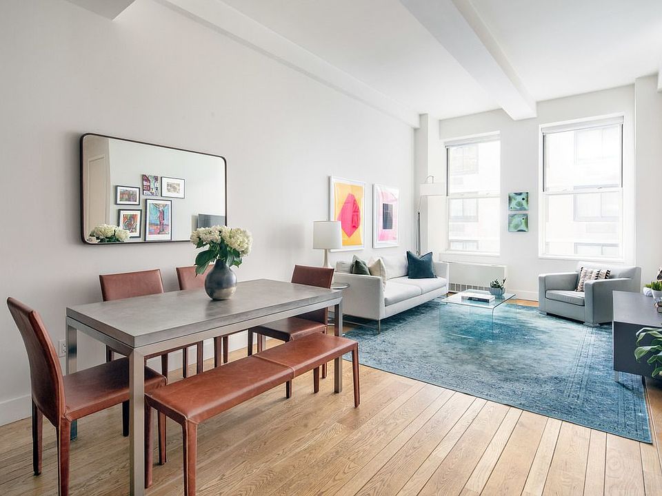 Residence 6D is a stunning, 1,282 square foot pre-war loft with two bedrooms, two bathrooms and a coveted additional home office. Defining features of this rarely available Flatiron condo include 11-foot concrete beamed ceilings and oversized picture windows. This voluminous home features an open, 34' long living space with gracious entertaining and dining areas. A massive chef's kitchen with a unique central island provides endless storage space and the ability for grand entertaining. Stainless steel appliances, custom cabinetry and stone countertops are in excellent condition and tastefully designed. Opposite the kitchen is a 7' x 7'9" bonus space which can be programmed as a home office, a nursery or a walk in pantry. The living room is light and airy, beautifully laid out and perfectly symmetrical. The large windows facing north make this room feel substantial in scale. The expansive master suite is 11'8" × 15'2" feet and can easily accommodate a king size bed plus additional furniture. A walk-in closet separates the bedroom from the large en-suite master bath which includes an oversized stall shower and a custom vanity with double sinks. The second bedroom and bathroom are also generous in size and tucked away from the home's living and dining areas. Abundant closet space and in-unit washer/dryer complete the creature comforts of the home. 49 East 21st Street is a boutique pre-war condominium with a full-time doorman, rooftop terrace, resident manager, and large private storage locker included with the sale. Building upgrades underway are newly renovated hallways, new roof deck furniture and a barbecue grill. The building is moments from Madison Square Park and some of New York City's most iconic restaurants including Eleven Madison, Gramercy Tavern and Union Square Café. Experience beautiful architecture and one of Manhattan's most convenient locations, with every major subway and amenity at your doorstep. Please note there is an assessment of $260.43 through 2021.