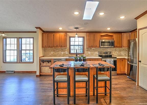 Multiple offers received. Upscale remodel of a spacious home in an established subdivision on a large corner lot with winter mountain views. This open plan home feels like new and features a glamorous kitchen with solid wood faced cabinetry, custom tile backsplash, new stainless appliances, new counters, and a big butcher block topped island. Kitchen opens to dining and large living area with solid wood crown moulding & trim, stone hearth and Buck gas stove for cozy winter nights. A beautiful master suite boasts solid wood barn doors opening to a large bath with skylight, soaking tub, and dual sinks. New custom tile in both baths and laundry, wood laminate flooring, new carpet, and fresh paint throughout. Solid wood sided exterior has 2 covered porches and a grill deck off the dining room, and is freshly restained. The large, near level lot has mature trees and room for gardening. Just 10 minutes from Walmart & Main Street Weaverville shops & restaurants. Hurry to be in for Christmas!