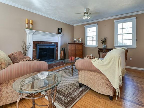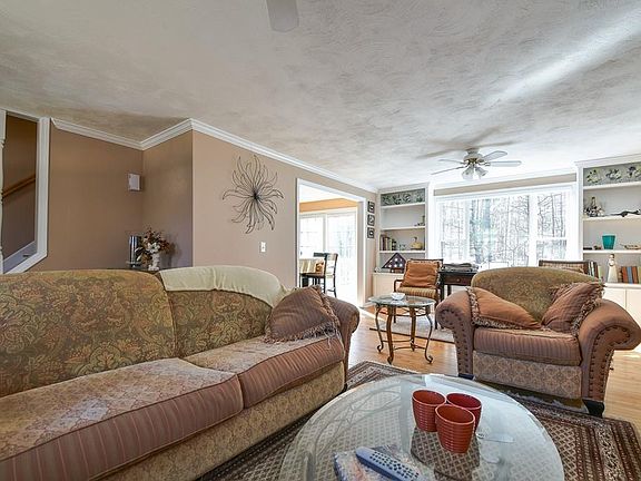 This charming colonial is situated on just under 2 acres of land in a private wooded setting.The spacious 2 car garage offers lots of storage options and there is an adjacent vinyl shed.Over the past 8 years there have been several updates which include a fully applianced kitchen with granite countertops,ceramic tile flooring,built in refrigerator and microwave,electric range,and recessed lighting.Both the half and full bath have also been redone with ceramic tile flooring, and the toilets,sinks,and upstairs shower and tub are part of those improvements.The roof,heating system,some windows,and the oversized deck have all been updated in the past 7 years.The spacious living room has a fireplace,picture window with a window seat and extra storage option,and lovely crown molding.Very large master bedroom offers a warm and cozy fireplace and hardwood flooring.Well air holding tank has recently been replaced.New septic system.Sliders from the kitchen to spacious deck.Central air.