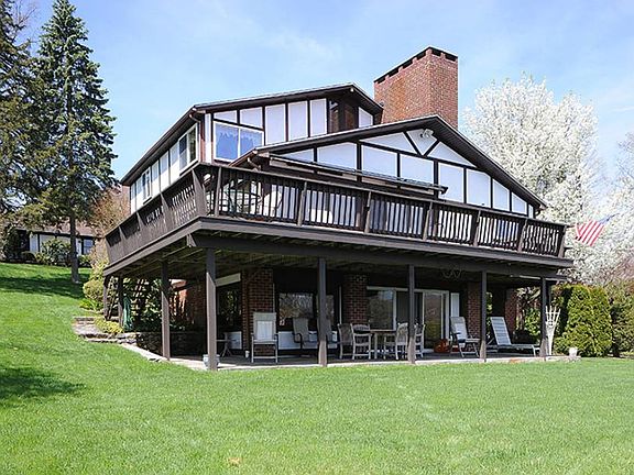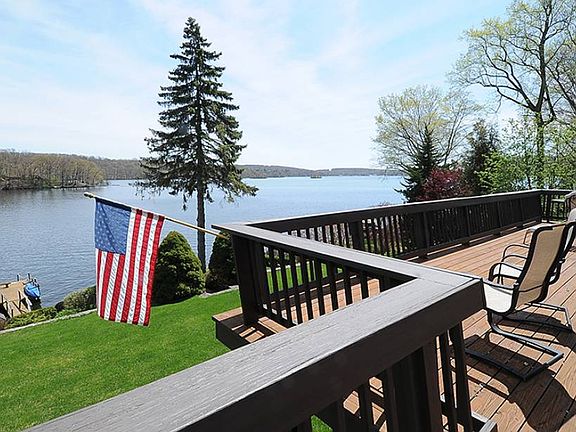 Welcome to Whispering Pines! Enjoy the spectacular panoramic views of Candlewood Lake from this direct waterfront home in a very private location. 100 feet of lakefront with boat dock, stone seawall and .49 acre of meticulously landscaped gardens and grounds. Many improvements have been made over the years. Dramatic great room with vaulted ceiling,floor to brick fireplace,pellet stove,wet bar,hardwood floors and walls of glass sliders providing the incredible views of lake and access to the expansive deck.Updated kitchen with granite counter tops,stainless appliances, cozy dining area,wood burning stove and more views!The formal living and dining rooms,a bedroom and full bath complete the main level. See addendum for full remarks.
