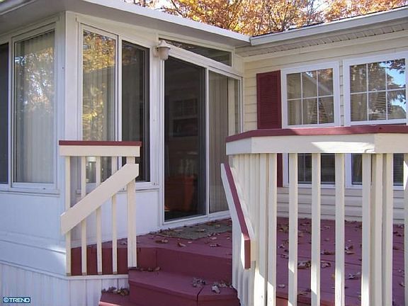 NO REAL ESTATE TAXES! Roomy Cameo double wide Ritz Craft home! Huge eat-in kit. with cath. ceilings, oak cab. Comfy LR w/cath cl'g,french doors lead to a den/study-a perfect spot to catch up on your email or read your favorite book.A 3 sesaon sunroom let's you enjoy the seasonal changes,MBR features a walk-in clos. and a generous sized mast.bath w/tub,hall bath with skylight,bedroom #2 is cozy, perfect for overnight guests,WA,DR&RF are included 2 freshly painted decks (front &side)allow you to savor the crisp fall air, the quiet beauty of winter, spring's awakening and summer's celebration.Brand new shed houses your outdoor furniture,lawn maitainance equipment,holiday decorations, bikes, etc.Hot water heater replaced in 2002,extra large driveway,paving stone patio in rear,economical gas ht. and C/A,monthly ground rent of $515.50 includes CCMUA, GTMUA, trash,street snow removal,clubhouse privileges and pool. Quiet cul-de-sac location.
