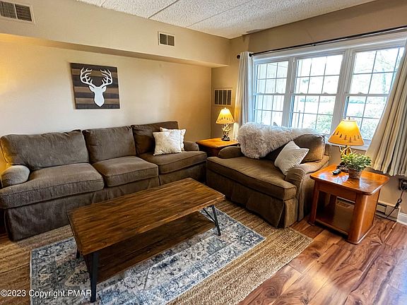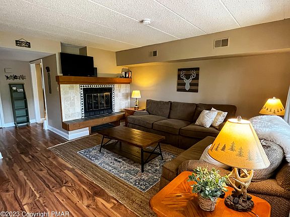 Lakefront condo with gorgeous mountain and lake views. First floor with patio and access to the community walking trail. This condo features two large bedrooms - one with adjoining full bath; one with a walk-in closet and access to the second full bath. Open living room, dining room, kitchen with pantry and stackable laundry closet. Electric insert fireplace. Community pool (seasonal). EV chargers available. Community water/sewer. Sweeping views of the lake and seasonal views of Big Boulder Ski runs. Sold furnished (see list of exclusions). Seller is a PA licensed realtor.