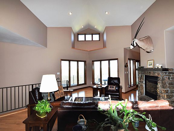 Sweeping views of the Missouri River from this custom built home. The kitchen boasts granite, stainless appliances to include a 5 burner gas cook top, with tiled back splash and pot filler, double wall ovens, and French door refrigerator. The double sided stone gas fireplace joins the kitchen and bright living area. Progress down the hall to the master retreat with deck access, tiled shower, soaking tub, private toilet room, two sinks, and walk in closet; two additional bedrooms and a full bath. The main level also features an office, additional half bath and main floor laundry. Step downstairs to the basement featuring a full bar and entertaining area with a pellet stove and access to the lower level patio, another bedroom, full bath and utility/workout room.