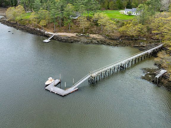 Tucked away on picturesque Westport Island—surrounded by the serene Sheepscot River to the east and the Sasanoa River to the west—this beautiful custom home is a balance of elegance, comfort, and classic Maine charm. With 3-4 bedrooms, 3.5 baths, and over 2,500 square feet of living space, the home is a retreat for those seeking privacy, beauty, and connection to the water. Built with enduring materials and an eye for detail, the open-concept layout is anchored by a striking Douglas Fir timber frame and a cathedral-ceilinged living room featuring a stone fireplace. The main level offers radiant heat beneath Douglas Fir floors, blending warmth with rustic sophistication. A screened porch with a tropical hardwood (Garapa) and deck beside the hot tub offer idyllic indoor-outdoor living. The kitchen is designed with cherry Durawood cabinetry, granite countertops, a large apron-front sink, oversized island with seating, induction cooktop, KitchenAid double wall oven, and pantry storage. Adjacent is a light-filled dining area beneath a soaring ceiling—perfect for hosting. The first-floor primary suite is a peaceful escape with patio doors opening to a private deck and hot tub. The ensuite bath features a glass shower, soaking tub and a walk-in closet for ample storage. The tiled entry/mudroom and laundry area with built-ins add everyday practicality. Upstairs, two spacious bedrooms (one with a private deck), a shared full bath with double vanity, and an office nook overlook the living space below. A large bonus room above the 3-car garage includes its own full bath—ideal for guests. Outdoor features include: a fenced-in yard, perennial gardens, potting shed, fieldstone walkways and fire pit. A deepwater dock opportunity adds appeal for boating enthusiasts. This is quintessential midcoast Maine living—private, peaceful, and perfectly designed for comfort and enjoyment.