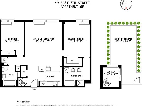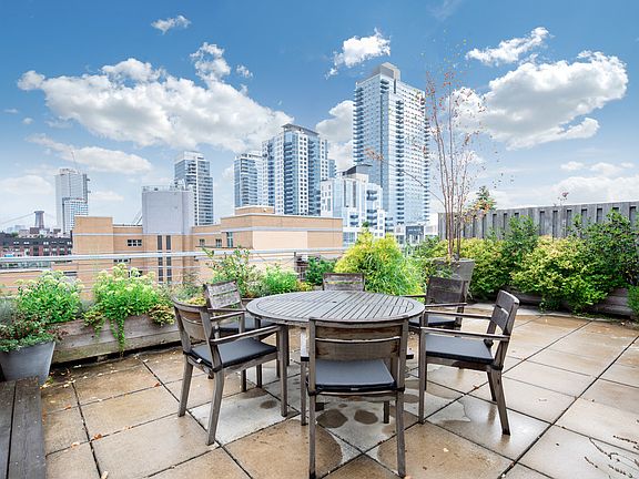 TOP FLOOR TWO BEDROOM WITH PRIVATE PARKING AND 800 SQUARE FOOT ROOF DECK. Spanning 1,116 square feet is this rarely available, two-bedroom two-bathroom penthouse with a bonus covered parking spot in the most desirable location on Williamsburg's Northside. The home's most incredible feature is the 800 square foot private rooftop with epic views of the Williamsburg Bridge, Manhattan skyline and East River. Enter Penthouse 6F and immediately appreciate the scale and width of this split two bedroom home. The chef's kitchen is equipped with a massive island, a high end appliance package and is open to the 15'9" x 16'5" living and dining room with oversized windows facing west and views of the Williamsburg Bridge. The master suite boasts a large 11'5" x 15" king-sized bedroom with a custom walk-in closet and a tucked away five-fixture master bathroom. The second bedroom has ample closet space and there is an additional full bathroom, in unit laundry and substantial auxiliary closet space. Up a private staircase is the penthouse's upper level which features a small sunroom and access to your private rooftop oasis. This fully landscaped terrace is a dream and comes outfitted with tons of seating and the option to entertain large groups or sunbathe. Catch sunsets and river views from this one-of-a-kind private Brooklyn rooftop. 49 North 8th Street is a boutique, full service condominium in the center of all Williamsburg's best shops, venues parks and restaurants and just steps from the L train and East River Ferry. Building amenities include a full time doorman, resident manager, fitness center, covered parking and a shared courtyard.