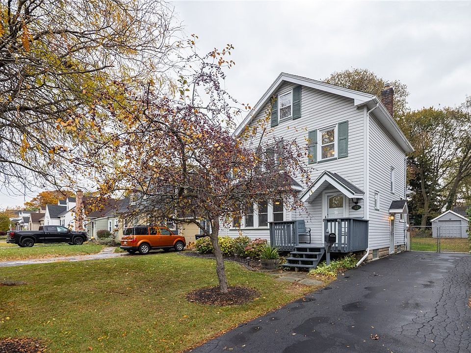 Welcome to 49 Orland Road...your new Irondequoit address! From the moment you walk into the ceramic-tiled foyer, you'll immediately notice the warm & inviting atmosphere that makes this house feel like a homey and love all of the possibilities! This charming home is a true gem, offering a perfect blend of comfort, style, & modern updates. The heart of the home is the upgraded kitchen, a chef's dream come true, and overlooks the dining area. It features modern stainless steel appliances, newer white cabinets, ample counter space, breakfast bar, & plenty of storage. The living areas are equally impressive, with plenty of room for relaxation & entertainment. The cozy formal living room offers built-in shelves on both sides of the decorative fireplace. The original hardwood floors throughout provide the perfect charm you expect from a home of this vintage. The 1/2 bath, recessed accent lighting, high chairrail in the dining area, and a rare family room complete the entry-level features. The 2nd floor is where you will find built-in bookshelves and desks in two of the 3 spacious bedrooms and a full bath. The full attic entry from the hall makes expansion or using it for storage a breeze. Extra storage areas can be found in the full basement and shed. Step outside through the slider in the family room to discover a large, solar-lit