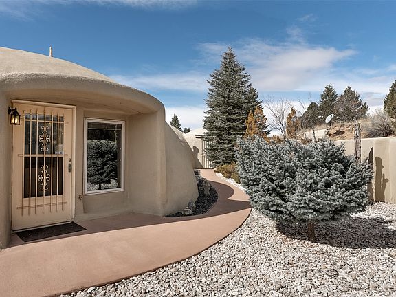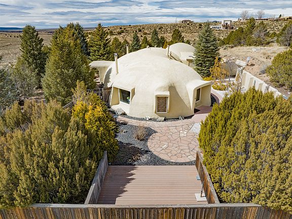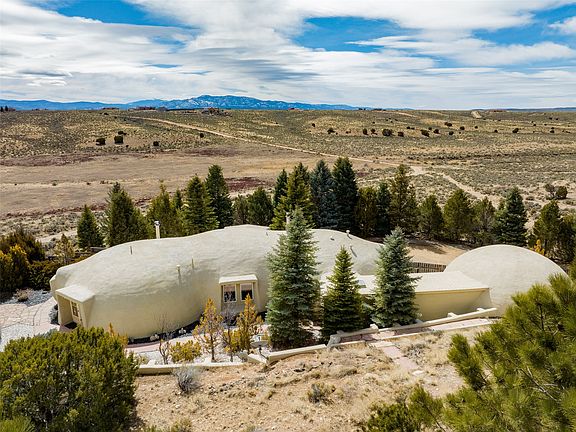 This unique monolithic dome home is a must-see, just twenty minutes northwest of Taos! Boasting a twelve-acre parcel, space and privacy are in no short supply with the sturdy, mature pines surrounding the home, a gently rolling hillside and an open pasture with many possibilities. There is also a second build site within the twelve acres for adding another building if desired. Because a monolithic dome is so well-built and insulated, this home is energy-efficient, disaster-proof, virtually maintenance-free, durable, and cost-efficient. Inside, enjoy an open den and dining area with a wood-burning stove, and a galley-style kitchen with ample counter space for preparing delicious meals. Never get caught in the snow or rain with the convenient built-in mudroom from the two-car garage. This home includes two guest rooms with a separate full bathroom, as well as a private primary bedroom with an ensuite bathroom and a spacious office/living area with built-in bookshelves and its own wood-burning stove. Outside, follow the winding, flagstone pathways trimmed by lovely, crushed quartz to the large deck with plenty of room to set up an outdoor lounge area or hot tub. With a private well, substantial underground propane tank, large back-up generator, and hook-ups for installing solar, this is a great property for someone who is keen to take charge of their own sustainability. Set yourself comfortably outside the norm with this statement home at 49 Padilla Trail!