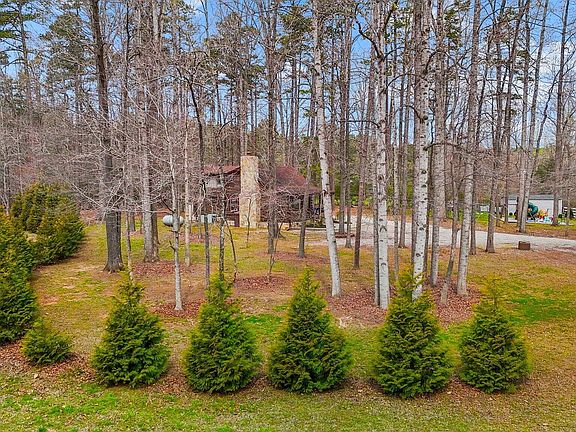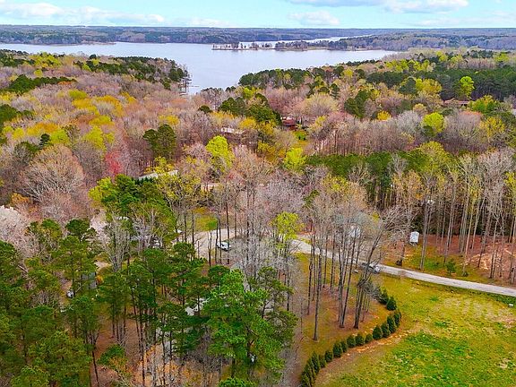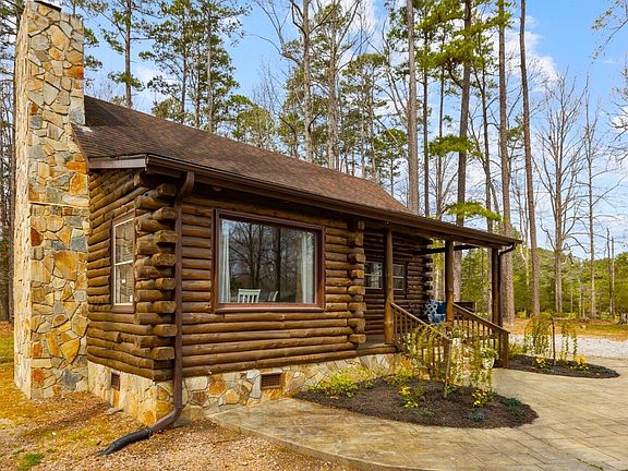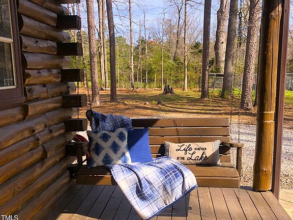 Wonderful getaway or permanent residence with a PRIVATE DOCK on Kerr Lake. LOG CABIN with all wood flooring on a partially wooded lot with a rocking chair covered front and side porch. Open floorplan with huge kitchen island that doubles as a breakfast bar, stainless steel appliances including stove, microwave, dishwasher and refrigerator, LOTS of countertop space and cabinetry, disposal, undercabinet lighting and pantry. Vaulted ceiling in family room with a stone surround masonry gas fireplace. Formal dining area with triple windows and an antler chandelier as the focal point. First floor primary suite has two closets. Full bath features a tub/shower combo with glassed shower doors. Upstairs has a secondary bedroom with half bath that includes a stacked washer/dryer area and the loft is being used as a sleeping area also. Stamped concrete patio with a graveled area firepit off of the side porch. So many areas to entertain or to just sit, sip and relax! Newly installed golf cart path at the end of Pebble Hill Lane in the cul de sac meanders through the woods to the PRIVATE DOCK on Kerr Lake. A short golf cart ride. Gas Pack on first floor with a heat pump mini split on second floor. There is a $450 dock permit fee required upon change of ownership in order to maintain the dock permit. A MUST SEE!!