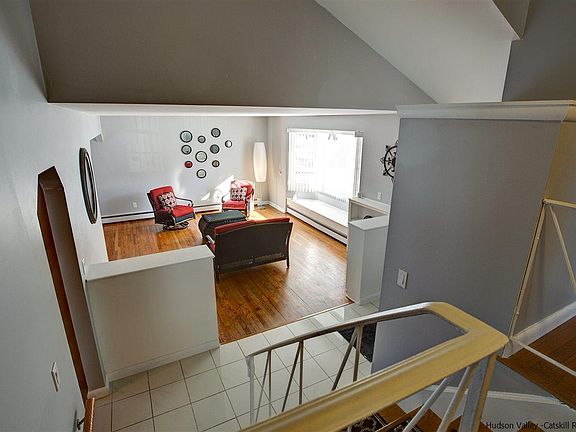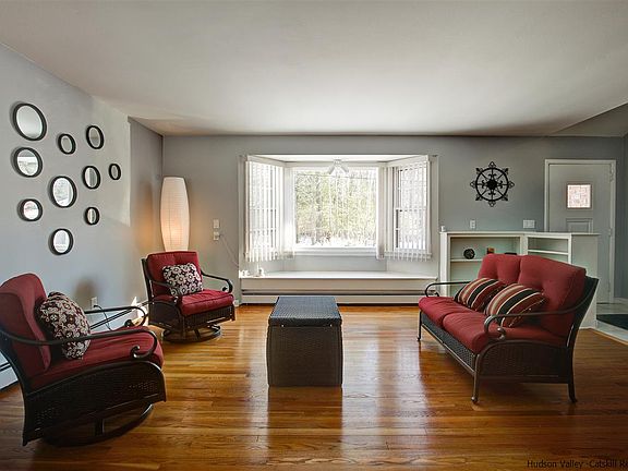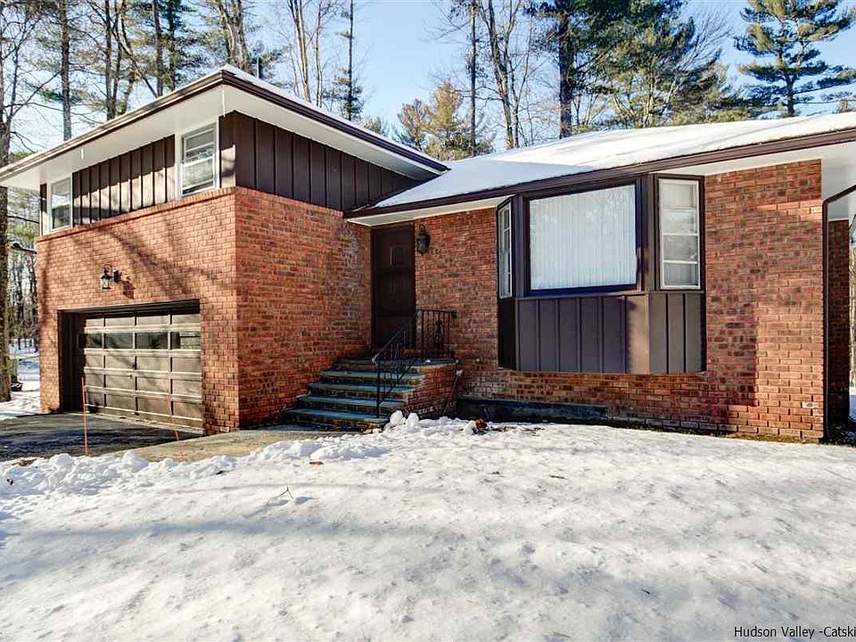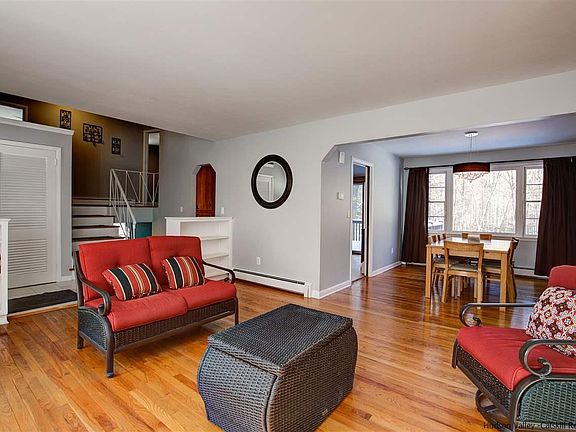 Set on just under an acre on a quiet country road within blocks of the Village Green, this light and sunny 1950s contemporary is newly painted inside and out and offers beautiful all-wood floors throughout. Living/dining room has a charming bay window with a built-in window seat in the front and large windows overlooking a spacious lawn and woods -- with seasonal views -- in the back. Eat-in kitchen with a sliding glass door leads to a deck perfect for grilling. On the top floor, there are three bedrooms, with the master having an en-suite bathroom. Separate den with half-bath, fireplace, and its own entrance could be used as a fourth bedroom. The basement to this turnkey home has two rooms that can be utilized as work space and/or a studio.