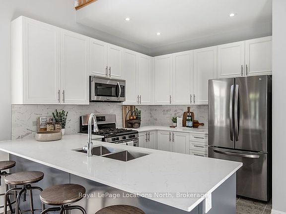 Welcome to this spacious 3-bedroom, 3-bathroom corner-unit townhome in the Georgian Sands community. The open-concept main floor is designed for modern living, featuring vaulted ceilings that create an open feel. The bright kitchen offers stainless steel appliances, an updated backsplash, quartz counters, and a convenient breakfast bar overlooking the dining nook. The inviting living room offers a cozy fireplace and a walkout to the backyard, perfect for entertaining or relaxing.The main floor primary bedroom features a private 5-piece ensuite with quartz counters, double sinks, walk in glass shower and tub. Just off the front entrance, a dedicated home office, that could be used as a 4th bedroom, with windows on both sides provides the ideal workspace filled with natural light.The whole home has been freshly painted and showcases newly finished stairs, adding a polished touch to the warm hardwood floors that flow throughout the main living areas. Quartz counters have also been added to all bathrooms, giving the home a sleek and modern finish. The unfinished basement is ready for your personal touches, offering endless potential to create additional living space to suit your lifestyle. Additional highlights include central air and plenty of natural light throughout.Located in a desirable neighbourhood close to Georgian Bay, with a park across the road, golfing, shopping, and amenities, this home is perfect for families, downsizers, looking for low maintenance living. You'll also enjoy how close this location is to to local restaurants, the brand-new Wasaga Beach arena and twin-pad facility, a state-of-the-art library and indoor walking track, and of course, the worlds longest freshwater beach.