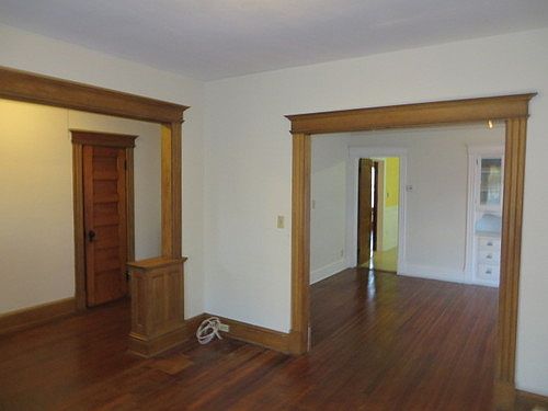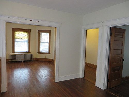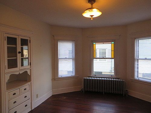 This 2 bedroom apartment is situated on the entire first floor of a 2 family house. The front door opens into a foyer, which expands into a front living room and dining room with stained glass windows and built in cabinet. The first bedroom is off the dining room, and opens on the other end into the hallway, making this a awesome bonus room if the apartment were used as a 1 bed. The kitchen is large and has a generously sized pantry. It is an ideal space for an island doubling as a table, surrounded by bar stools. The back bedroom has a view of the fenced in backyard. Please note that the vintage charm is authentic, and the kitchen and bathroom are truly retro. Gorgeous hardwood floors shine throughout, softening the space and lending to its warm and homey feel . There is laundry and storage in the basement, a garage parking space, as well as another space in the driveway.