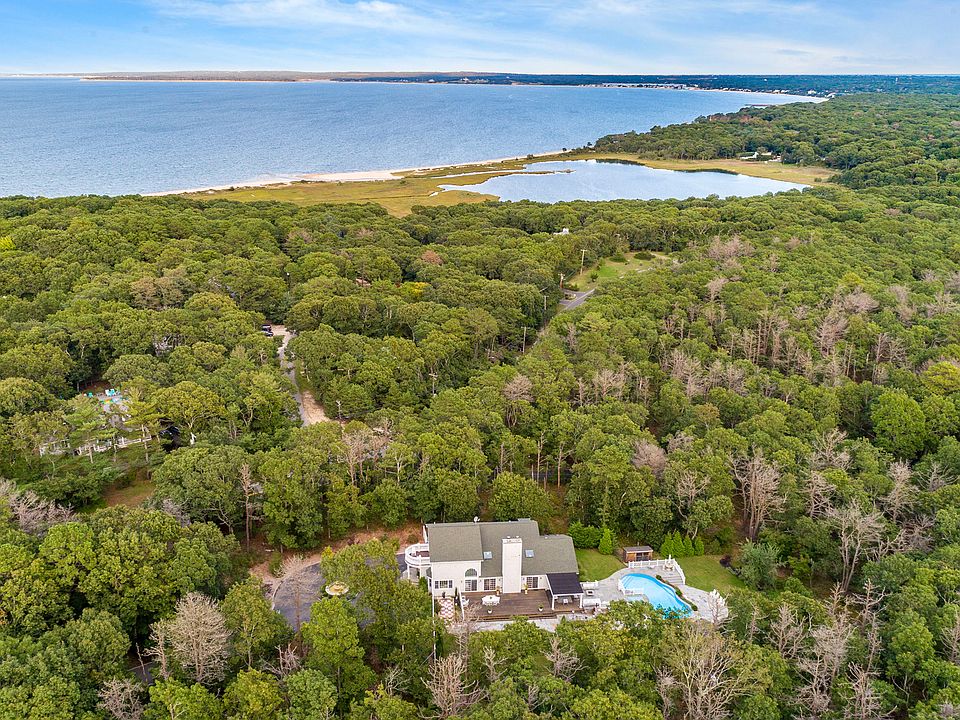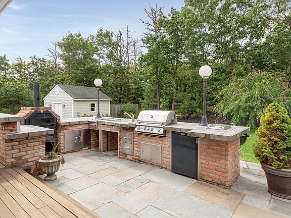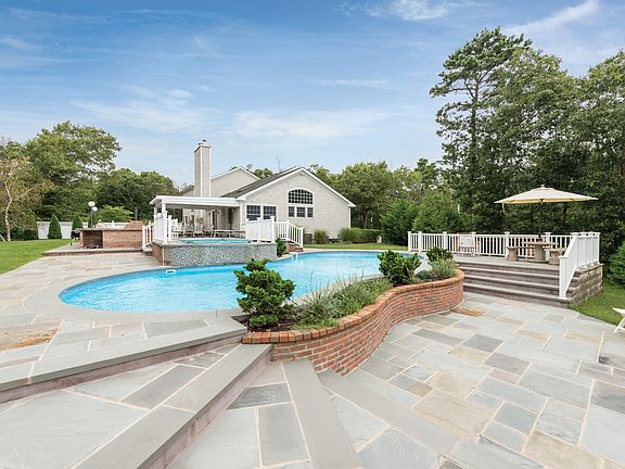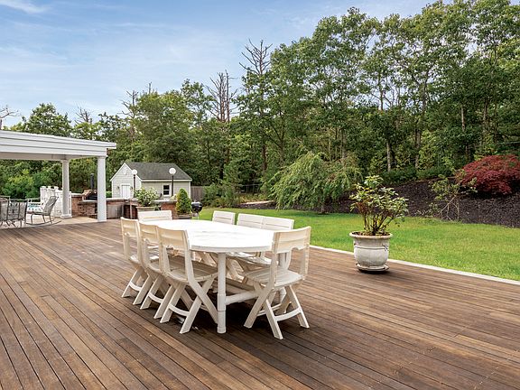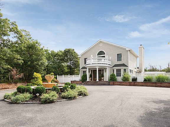 On bucolic Red Creek Road in Hampton Bays, this two-story postmodern home on 3+/- acres has five bedrooms and four baths. It borders several acres of protected open space, and is perfectly planned for entertaining or relaxing in good company, indoors or out. The driveway opens into a parking court with a formal fountain. The columned entrance reveals a light-filled open living space brilliantly illuminated by huge glass doors, large windows and a skylight. The living room, complete with fireplace, flows to a formal dining area which seats twelve. Adjacent is the eat-in chef's kitchen with central island, cooktop, stainless steel appliances and a breakfast area. Multiple glass doors open to a spacious rear deck and patio areas. Spend convivial or quiet time in an intimate sitting room or bright den. Upstairs the gracious master suite opens to an elegant terrace and features a beautiful bath with a double vanity and spa tub. Two additional bedrooms share another full bath. An additional bedroom and full bath are on the finished lower level, along with a wet bar and large recreation room, which can be used for a gym.Celebrate fine weather in the outdoor living areas, where you can gather or relax on the extensive bluestone patio or covered deck. Create snacks and meals in the full outdoor kitchen, which includes a pizza oven. Enjoy the heated saltwater pool or relax in the spa. The property comes with bay beach privileges, and the pristine ocean beaches of Hampton Bays are just minutes away.