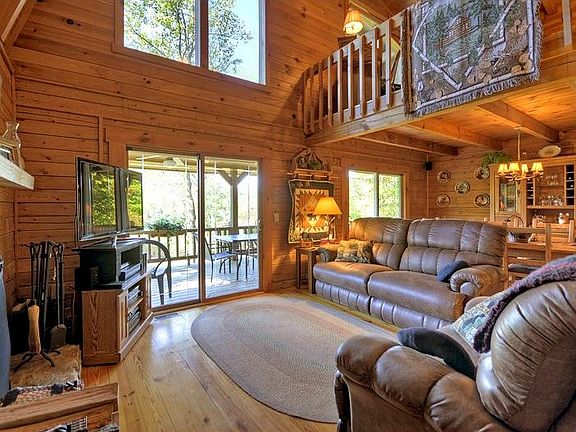 Fireside Log Cabin 2BR/2BA w/metal roof! Cabin overlooks large common area with frontage on Trout Stream,Conasauga Creek. Long range mtn.view from Great Room & Dining Area! Main level: Great Room w/stone fplc, kitchen, laundry, full bath, guest BR; oversized 2 car garage+carport w/workshop. 2nd level Master BR loft w/office full bath,huge closet. Lower level media room, 2nd laundry and large storage area. Media area opens to oversized screened deck, under this deck area is additional storage. Behind cabin is a two story workshop w/heat/air/water! 03/29/17
