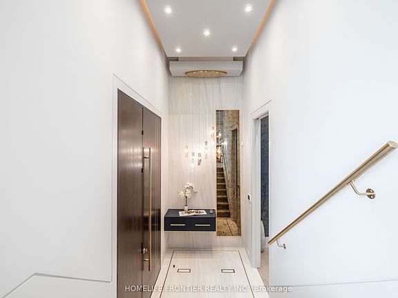 Discover a masterfully crafted home, ideal for both intimate family living and hosting guests.Situated in the coveted Newtonbrook East area, this modern 4+1 bedroom residence show casestruly opulent amenities. The striking Indian Precast facade, enhanced by expert landscaping, be spoke interlock, and beautiful evening lights, makes an immediate impression. Enter into amajestic foyer and office with soaring 13' ceilings. A dramatic open-plan concept flows throughout the entire home. The spacious interior features recessed ceilings with concealed lighting, custom chandeliers, massive windows, sleek linear fireplaces, and brass details onevery level, radiating pure elegance. A showcase wine cellar and tailored hardwood flooring withbrass inlays add to the charm. The gourmet kitchen is a culinary paradise, fitted with premium integrated appliances. The family room, finished with Italian porcelain, recessed ceilings, andpot lights, opens to a large wooden deck overlooking the yard, perfect for gatherings. Climbthe specially designed staircase with its glass banister, huge skylight, and large window thatfills the space with sunlight. Find the graceful, south-oriented primary suite, complete with alavish six-piece ensuite, fireplace, and a walk-in closet brightened by a skylight. Every other bedroom includes a private ensuite with Italian porcelain walls and warm floors. The spectacular lower level has towering ceilings, heated porcelain floors, and a beautiful recreation room with a wet bar, all lit by sunshine from large windows. Two separate walk-upexits and an extra nanny suite with its own closet and heated ensuite complete this level. Thehuge, landscaped backyard is enclosed by tall privacy fencing, creating a peaceful sanctuary.Close to excellent schools, stores, and restaurants. This property represents the pinnacle ofluxury, comfort, and prime location.
