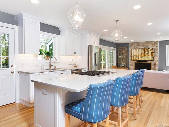Set up high off a popular street in Cos Cob, this charming 4 bedroom house offers complete privacy and has it all: open floor plan with a gorgeous, newly renovated kitchen with marble counter tops, a 12-foot island and high-end appliances and finishes. An expansive deck off the kitchen is perfect for entertaining and leads to a flat yard with mature landscaping and a hidden garden. A two-car garage opens to a finished basement with a half bath and plenty of space for a mudroom, a playroom or a second living space. On the second level, the large master bedroom with a vaulted ceiling and skylight is one of four spacious bedrooms. The house was freshly painted on both the exterior and interior.
