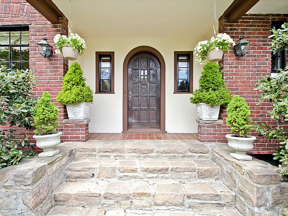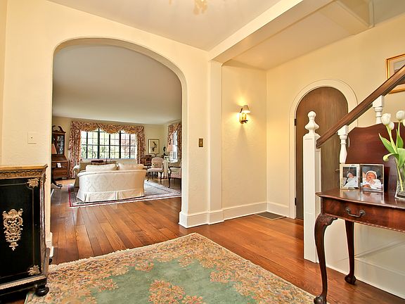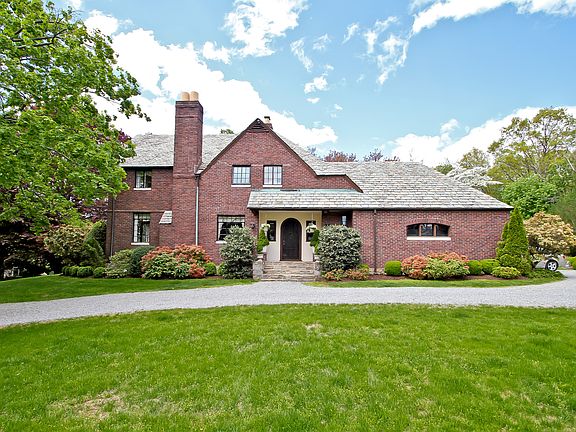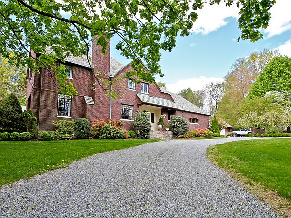 this stately colonial has a traditional floor plan with high ceilings, detailed moldings and lovely private grounds with beautiful english gardens. Formal living and dining rooms feature arched doorways, random width pegged floors and stained glass french doors that open onto a two tiered terrace. Every room boasts large windows with scenic views.
