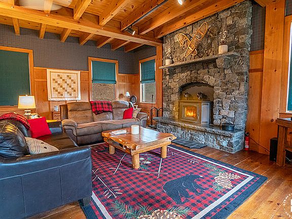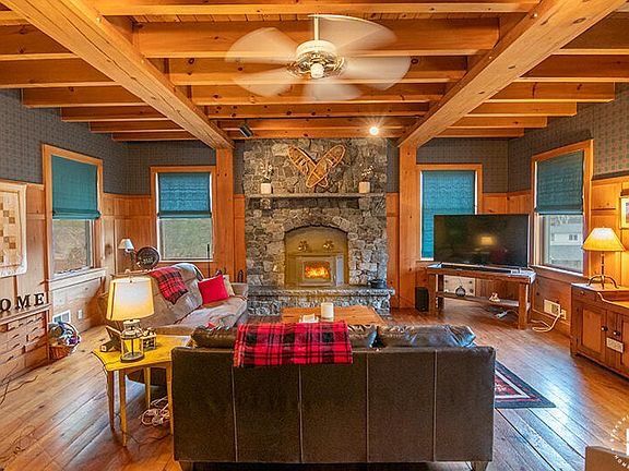This charming and cozy home boasts quality woodwork, large plank cedar floors and striking wood beams that showcase the unique character of this property. Two of the bedrooms each have their own lofts, fun for sleeping. The open concept kitchen and dining room are perfect for entertaining. The kitchen and bathrooms have all been recently upgraded and remodeled. Enjoy the tranquility of the large screened porch and private yard or spend evenings by the fire pit in the cozy log lean-to. Car enthusiasts will appreciate the 3 car garage with 2 heated stalls, 220 amp service and high ceilings suitable for lift installation. Conveniently located less than a mile from the town beach, marina and lake. Additionally there is direct access to snowmobile trails right from the driveway. This home has it all!