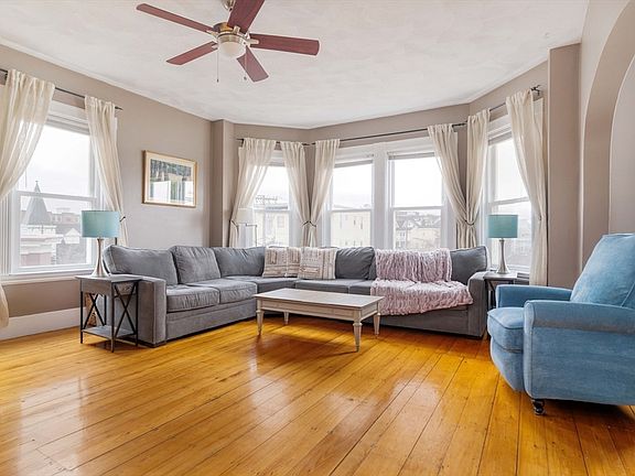 Top-floor, sun-filled condo with Boston skyline views! Enjoy easy access to public transit, I-93, Assembly Square, and Foss Park – Somerville's largest green space. The newly opened Green Line extension is a short walk away, providing easy access to Boston and Medford. Steps from Winter Hill Brewery, and within walking distance of top dining (Sarma, Field & Vine, Celeste, La Brasa, Colette Bakery). This spacious unit boasts a large kitchen with oversized island and stainless steel appliances (including a wine fridge and new stove), plus a generous living room with bay windows and study nook. Two roomy bedrooms, a dedicated dining area, laundry with modern washer/dryer and extra storage ensure easy living. Wide pine floors, ceramic tile in kitchen and bath, and a newer furnace add to the appeal. A private covered porch, deeded parking, and basement storage complete this rare find in a supremely convenient location!