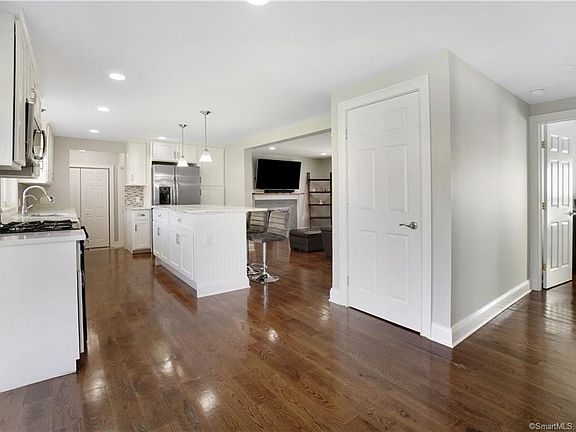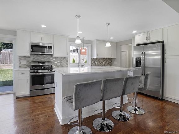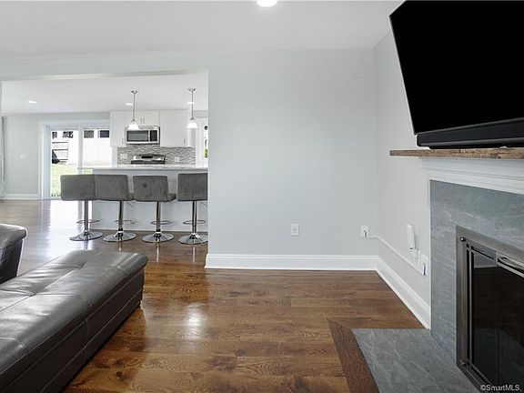 Privacy and convenience...Enjoy the best of both worlds in this gorgeous and turnkey 4 bedroom, 3 bath colonial, situated on a quiet cul de sac, yet right in Stratfords Paradise Green neighborhood! Rebuilt in 2016, this home is immaculate from top to bottom, inside and out! Set on a level, green-grassy lot with irrigation system and attached, two-car garage, you will be greeted by welcoming new paver walkway and stone-clad front porch. Once inside, notice the open concept which gives a view of the custom wood-burning fireplace from living, kitchen and dining room. Oak hardwood floors, stained in Chestnut, flow throughout the entire house. The bright and cheery eat-in kitchen allows a wonderful view of the backyard and is outfitted with white, Shaker-style, birch cabinets, with brushed nickel hardware, granite countertops, SS appliances, recessed lighting, and glass tile backsplash. A glass slider leads to a covered patio, perfect for grilling and entertaining outdoors. Looking for main level living? The first floor includes a bedroom and full bath! Second level includes two more bedrooms, a full hall bath with tub, a laundry room, and a master en suite with walk-in shower and double vanity. All newer mechanicals, including energy efficient propane furnace and Central Air. Without so much as a picture hook in these walls, youll feel like original homeowners at 49 Terry Place!