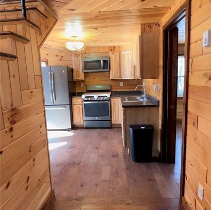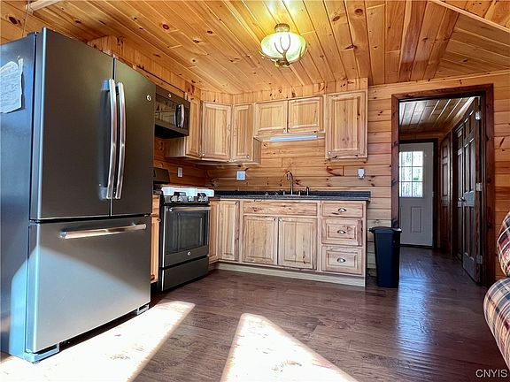 This fully finished cabin on 5 private, wooded acres was built in 2016 and is waiting for someone to call it their own. Never been lived in, everything inside is pristine and clean. The cabin offers 900 square feet of custom carpentry with gorgeous tongue and groove pine, hardwood staircase, and engineered hardwood throughout. Natural light beams through the cabin’s gable windows, making the space extra cozy. The kitchen has brand new slate appliances, beautiful hickory cabinetry and extra storage underneath the stairwell. There is a drilled well, septic, and underground power already hooked up. This place is move-in ready! Located directly on the snowmobile trail and situated within the Northern Tier hunting zone yet only 45 minutes to Syracuse, 20 mins to Salmon River Reservoir, 5 mins to Kasoag Lake, and 25 minutes to Pulaski and Lake Ontario, known for world-class salmon and steelhead fishing.