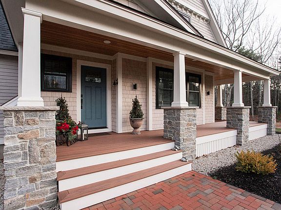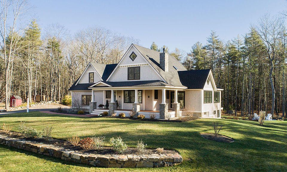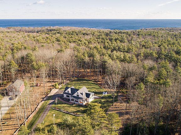 Light and airy take on a quintessential Maine Woods craftsman style home in Cape Neddick. Set on 2.75 quiet and professionally landscaped acres near the end of a gravel country road just a 1/2 mile from popular Cape Neddick Beach, this spacious home offers a fresh seaside inspired palette & stunning craftsmanship, many inviting spaces, and an abundance of natural light thanks to the many windows overlooking the tranquil landscape. The main floor offers many rich layers of welcoming living spaces that blend seamlessly together. Everyone will want to gather in the eat-in kitchen that forms the heart of the open floor plan. A cozy hearth centered living room blends into the bright and sunny vaulted ceiling dining room and natural exposed wood beam sunroom. Enjoy single floor living with the master suite designed for privacy down the hallway large enough for a walk in closet and master bath with custom tile. Head up the light filled staircase to an open bar area, expansive craftsman woodwork inspired family room, two large & airy bedrooms and a crisp shiplap inspired bathroom. The attention to detail and level of finish work in this home is truly impressive. Take in the wildlife and fresh Maine breezes on the classic wraparound stone & exposed timber front porch, entertain and enjoy the sunshine on the large stone patio out back, or gather wood for a relaxing evening around the fire pit. After a long day at the beach, come home and rinse off in the outdoor shower. Huge walk out unfinished basement with potential for additional living space if desired. Take a hike along the old rail bed from your back yard or take advantage of the many nearby amenities that this thriving area has to offer conveniently located only minutes from Ogunquit and York Village. Or simply kick back and call one of the most peaceful, hidden and unspoiled areas of coastal York all yours.