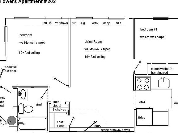 Quiet, efficient 2-BR apartment on 2nd floor in rear of building. Large windows, high ceilings in LR/BRs plus cool old archway in LR and old doorway in big BR with masonry wall and wainscoting in small BR. W/w carpet in LR & both BR, vinyl in kitchen, bath and entry/coat closet. Cool ceiling fan in LR. Smaller kitchen, but has all the things you need - full size stove/fridge/dishwasher! Good amount of closets (3 in BRs, coat, linen). 12-steps to laundry room. 1-year lease rolls into month-to-month after initial term. Resident pays electric (including heat) and cable/internet. Management pays water/sewer/trash. Sorry, No Pets. Please call to discuss this opportunity. Management prefers to talk directly to interested parties, before setting up visits. We will not reply to generic inquiries that contain no information about the potential applicant/resident. Just like we put in lot of information about the apartment here on this listing, we want to know some things about an applicant before we will set up a tour. We need to know at least: number of people, general ages, smokers, pets (none in this apt), employment info, number of cars and timeframe. Then we can talk. Without this info, we don't know if the situation is worth pursuing.