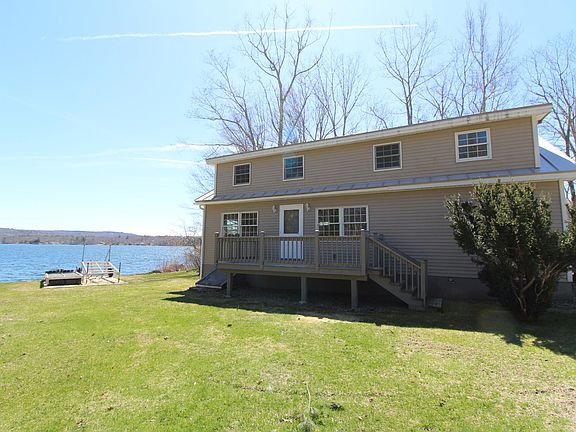 Stunning, serene and beautiful home and property, on highly sought after, Swan Lake. Enjoy the most beautiful sunrises AND sunsets you've ever dreamed of, right from your very own, spacious lakefront home on 210' waterfront. Home features a first floor open flow from the modern kitchen, featuring granite counters, newer appliances and tile floors: Opens with a breakfast nook to the dining area; which in turn, opens to the spacious living room. Everyone will appreciate the views across the lake no matter where they're sitting. The glass across the water side of the home allows a flood of natural light through. The primary bedroom is on the first floor and yes of course, overlooks the water. This spacious bedroom offers double closets and ample wall space for the dressers. Private entry to the first floor, full bath is accessible from this master bedroom; access to this full bath also from the coat room ~ Jack and Jill entrance. The washer and dryer are also on the first floor, making this one floor living if desired. Upstairs are 2 bedrooms, each with closets. One of these bedrooms has a private, full bath. Nice deck off the entrance from the living room. There are 2 garages; the first is the detached 2 car measuring 26'x36' and offers wood heat. The 2nd garage is 3 bays of space, measuring 24'x32', ideal for your lawn tractors, boats, additional autos, workshop and much more. The amount of storage and work space is very hard to find on lakefront property. This is a wonderful asset. A whole house generator will be appreciated should there be a loss of power. There is a drilled well, conventional 3 bedroom septic system Baseboard hot water heat. Property comes with the aluminum dock system, many furnishings and yard tools. This year-round lake house offers it all, folks, but it will not be available for long. Don't hesitate. Call today!