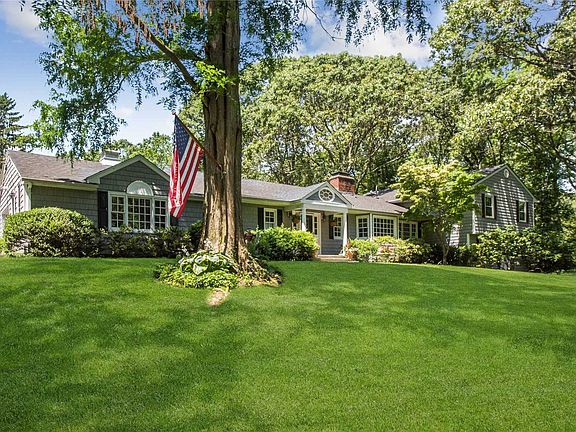 Sprawling five bedroom Split ranch picturesquely set back on two lush acres offering peace & tranquility. The long private driveway leads to this charming home featuring a formal living room w/fireplace,builtin wet bar & french glass doors to the patio, formal dining room, den w/fireplace, eat in kitchen w/breakfast area & large master suite & bath. Enjoy complete privacy and beautiful gardens surrounding the patio and rear yard area. CAC, Buderus Boiler. Generator hookup. Beach & Mooring. CSH SD#2