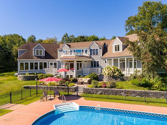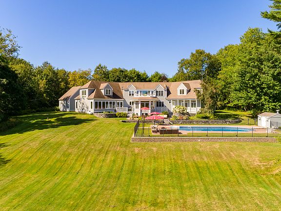 This beautiful home was architecturally designed to maximize the stunning backyard fields, woods and brook, offering simple yet elegant living in a private setting. Close to shopping and award-winning schools, it is an easy 20-minute drive to Portland. The marble floor entrance leads to all the spaces that make this home a delight. The library's wood fired fp makes this a perfect place to unwind. The large formal dining room and adjacent sunroom, overlook the professionally landscaped yard, patio and gated in-ground pool. The kitchen is a chef's delight with granite countertops, high-end appliances and casual eating area. It is open to the welcoming family room where a wall of large windows decorate this spacious area with nature, and the gas fired fp with cabinets and bookshelves provide warmth and ambiance. The other end of the home has a full bath, a lovely guest suite with 1/2 bath and separate entrance, and a spacious office opening to a covered private porch. Upstairs, the primary suite features a large walk-in closet, private deck overlooking the fields and an ensuite bath with jacuzzi tub and separate shower. Also upstairs are three bedrooms and a full bath. The largest bedroom features 11-foot ceilings and could serve as an art studio or hobby room. The finished daylight basement has built-ins, a workspace and ample space for a gym and recreation. The oversized 3-car garage has a large workbench and a full second floor for storage. The generator provides assurance on those rough winter days/nights! Heat pumps in the family room, basement and primary suite keep it comfortable year-round. The home is beautiful, as is its setting. The backyard's large pool, playing areas, brook, natural fields, wildlife and songbirds grace the house with pastoral beauty. The unique combination of space, beauty and serenity define this lovely home.