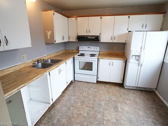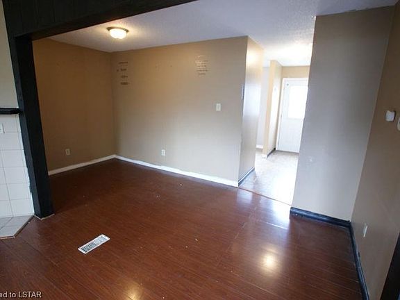 End unit. Vacant. 3 bed townhome with new forced air gas furnace and air conditioner (rented for $79.09/mth for 84 months, started April 2020). Fireplace in living room. Finished recroom in basement with big window. 2 assigned parking spaces which are right in front of this unit. Walking distance to Fanshawe College. Condo fee is $233/mth. Property tax is $1527/yr.