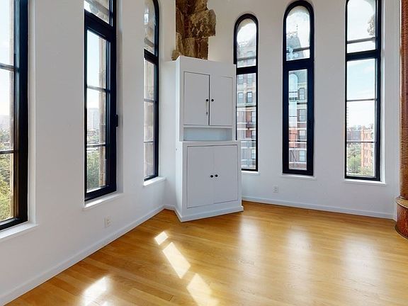 Architectural Digest castle style home- the entire tower unit of renowned full service Church Court building in the Back Bay-- boasting Boston's best 360 degree view from the peak. Floor by floor living, walk into an amazing foyer with washer/dryer, half bath, and soaring ceiling height. A chef's eat-in kitchen with gorgeous custom jewel toned cabinetry, stainless steel appliances, huge island / kitchen table, storage galore, and floor to ceiling windows. A stunning living space with a couch and a coffee table that can expand to be a dining table. Access to a private terrace that overlooks the gorgeous landscaped courtyard. Office / 2nd bedroom with couch that transforms to a bed. Full bath. Spectacular main bedroom. Gorgeous reading landing. Top floor is a jaw dropping design masterpiece with floor to ceiling windows and million dollar views. Exposed stone wall, central AC, and hardwood floors throughout complete this property. Rent Fee Includes: Water, Sewerage Disposal, Refuse Removal, Snow Removal, Grounds Maintenance, Garden Area, Furnishings (See Remarks), Security. 12 Months. Partially furnished.