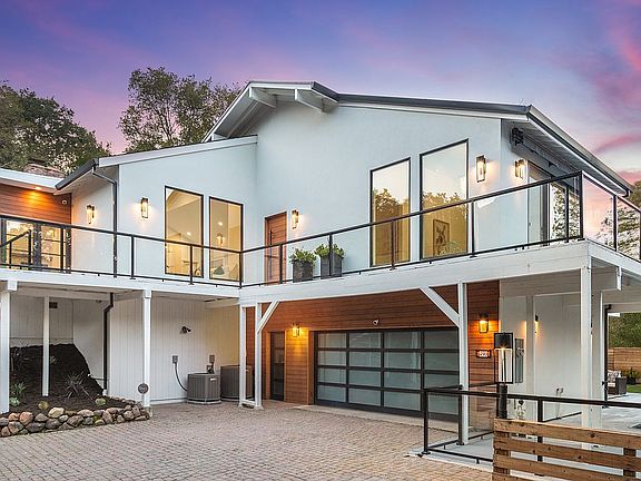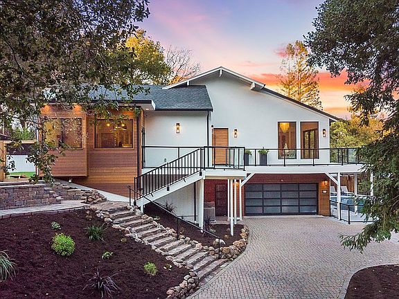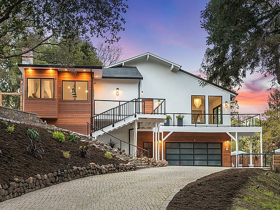 Completely re-built inside and out, this stunning contemporary home is tucked away offering a private setting, in one of Westside Danville’s most prestigious neighborhoods. Enjoy breathtaking views of Mt. Diablo and Las Trampas Hills from this secluded hillside location, yet a short walk to downtown Danville. On just over an acre, this property features a private steel enforced bridge, a trickling creek and beautiful surroundings with mature landscape. The amazing backyard boasts a sparkling pool, covered patio space with Panoramic doors, and an upper entertaining area with private deck, spacious patio, gas fire pit and lawn area for play. This beautiful home has been renovated to the highest possible standards. Contemporary upgrades include a modern new exterior with wood siding, new garage doors, large picturesque windows, and balcony glass railings. The open floor plan offers vaulted ceilings, wide-plank hardwood floors, designer lighting and gorgeous living spaces including an open family/kitchen combo that opens to the backyard, an elegant dining room with an impressive wine wall feature, and lower level bonus room open to the backyard. The magnificently appointed gourmet kitchen offers beautiful white cabinetry, quartz countertops, Dacor and KitchenAid stainless steel appliances, 48' dual fuel Dacor Modernist range, two Miele dishwashers, beverage fridge and a stunning waterfall island with breakfast bar. The kitchen is open to a lovely family room and breakfast nook with a gas fireplace. The master bedroom retreat features plush carpet and opens to a balcony with gorgeous views. The spa-like ensuite boasts Calacutta gold floors and Thassos marble counters, a stunning free-standing soaking tub inside the glass-enclosed wet room with rain shower, and a large walk-in closet. Upstairs offer three secondary bedrooms, great loft/bonus space and all bathrooms have Carrara marble counters. Walk or bike to award-winning San Ramon Valley schools, walking trails, shopping and restaurants in historic downtown Danville.