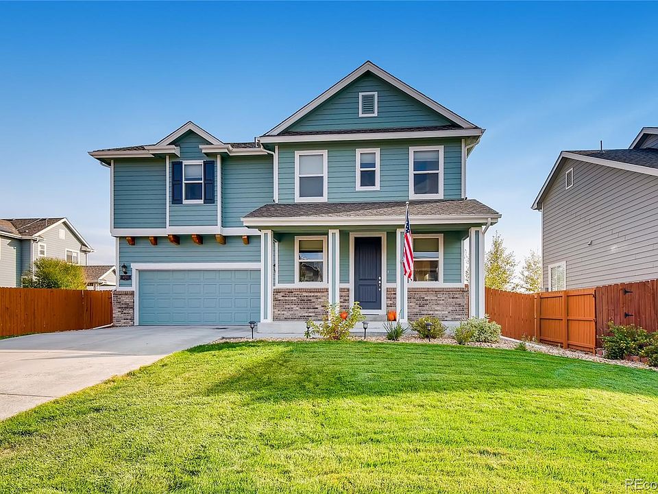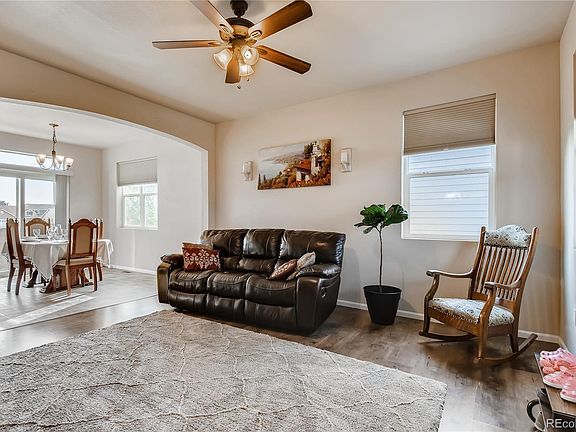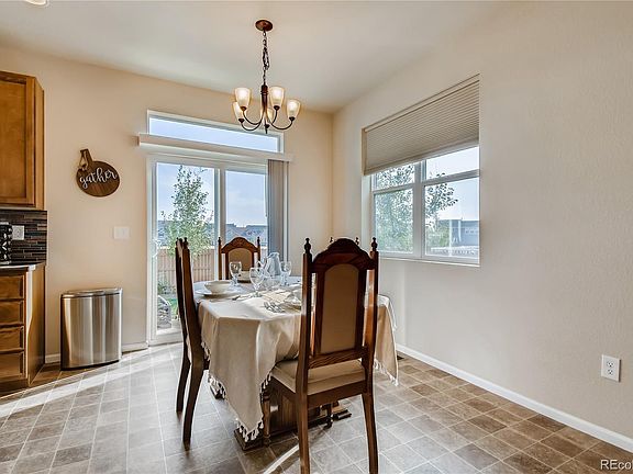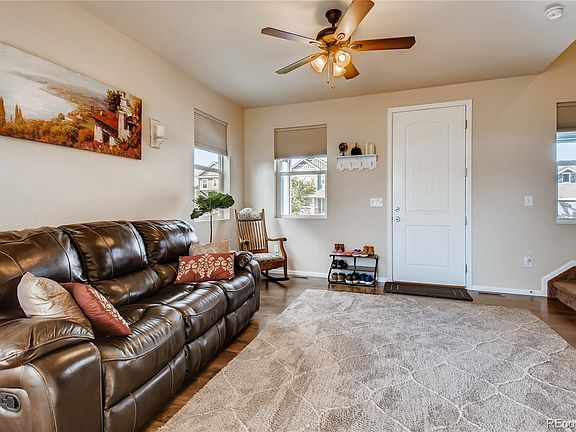 Move-in ready Sharpe Farms home backing to open space. A well-maintained exterior, lush lawn & welcoming front porch make for eye-catching curb appeal. This lovingly cared for home boasts high ceilings, tall doors, fresh paint & abundant natural light throughout. Enjoy an open main floor that makes for easy conversation and connection with family and friends. Seamlessly transition to outdoor entertaining via a sliding glass door off the dining room that opens out to the new patio. Dine under the stars and enjoy the added privacy of having no rear neighbors from the fenced backyard that has been recently landscaped and includes raised garden beds. Well-equipped kitchen features an island with seating, a tile backsplash, modern recessed lighting & a pantry. All 3 sunny bedrooms and the laundry room are conveniently located on the upper level. Spacious primary suite impresses with double door entry, a walk-in closet & an en-suite bathroom with double sinks. Additional upgrades include a new roof as of 2019 and a finished attached 2-car garage. Wonderful location in a quiet neighborhood with community trails, a park & a playground with easy access to I-25 for painless commuting.
