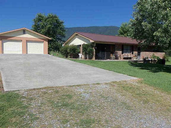 Small mini farm with nice brick home and large detached 2 car garage and small barn. Two bedroom, 1 bath with sun room and laundry room. This home has been well kept and very clean. All level 9 acres of land are in grass, at the foot of English Mtn with fantastic views.