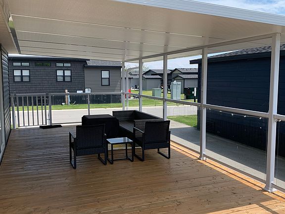 This is Quarry Meadows #144, the popular Onyx model located on a corner lot! Highly desirable area, financeable model ready to move in and enjoy for the season! Three bedroom, 1 bathroom, bright and modern inside with stainless steel appliances, large kitchen island, and a fireplace. Large partially covered deck, patio with fire pit, and large shed are all a part of this package. Contact the Sherkston sales team today!