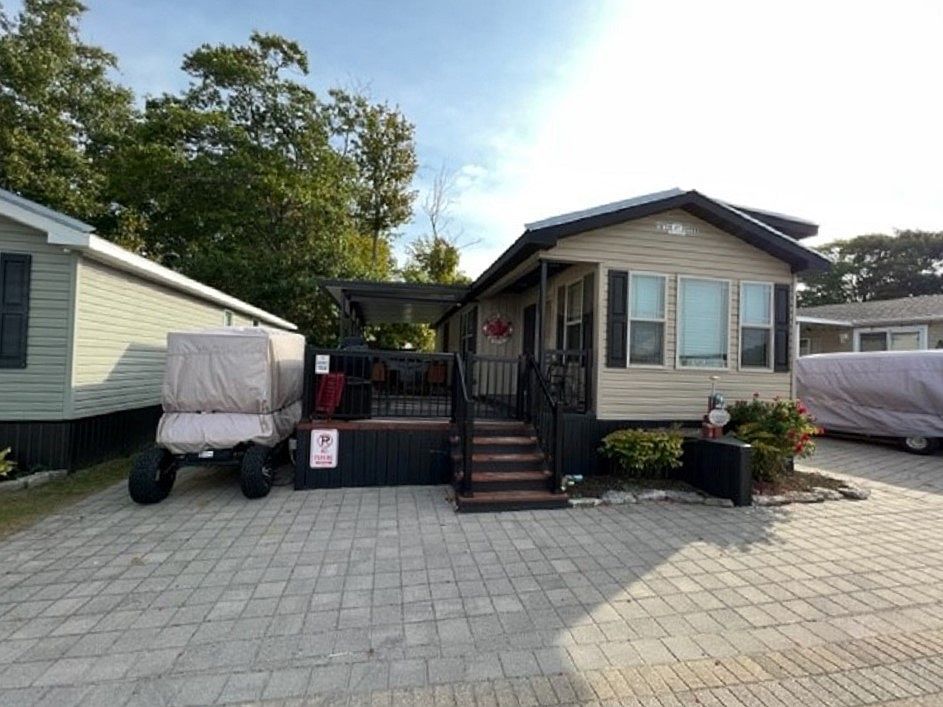 Welcome to Wyldewood Beach Club #159! This spacious cottage is 14' wide, has 2 bedrooms, 1 bathroom, and central AC. The large deck is partially covered and steps down to the rear patio. Additional outdoor patio space with a chiminea is the perfect spot to enjoy evenings under the stars! Kitchen has lots of cabinets for storage and is open to the dining and living room area. Primary bedroom has built-in cabinets and the second bedroom has bunk beds. This cottage comes with a golf cart, with new wheels and batteries! Completely turn-key! Contact the Sherkston sales team today!