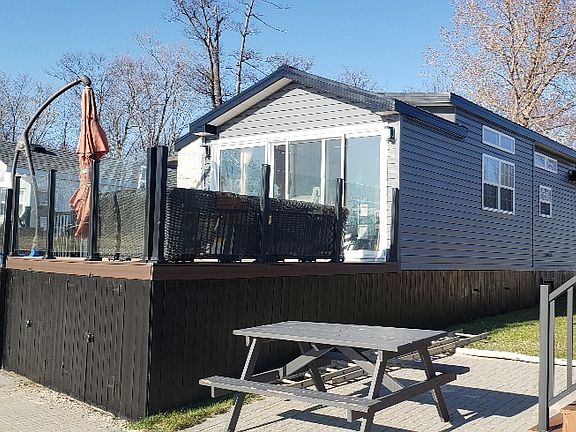 *BEACHFRONT!* Welcome to Wyldewood Beach Club #228! Located at the end of the road, with no regular traffic driving by, you will enjoy lake life at this beach house. Updated and move-in ready, this cottage and has upgraded features unlike most in the park! Enjoy the beach view from both inside and outside! The extended COMPOSITE deck is complete with infinity edge glass rail system for a seamless view of the beach from sunrise to stunning sunset! Living room fireplace is 2 sided so you can enjoy it on the deck, located beside the outdoor entertainment system. Bright and spacious with high ceilings to accommodate the transom windows, the custom kitchen has a built in wall oven and microwave, counter stove top with modern hood fan, and tons of storage. With 2 bedrooms, 1 bathroom, there is room for the whole family to enjoy this beach house! The extra large shed, complete with electrical outlet, is large enough to park and store a golf cart inside. Must be seen! Contact the Sherkston sales team to book your appointment! Private driveway for 2 cars. Over sized shed. Aluminum roof. Outdoor entertainment unit with electric door with the TV and fridge. New mini-split heating/cooling units, operated by remote.