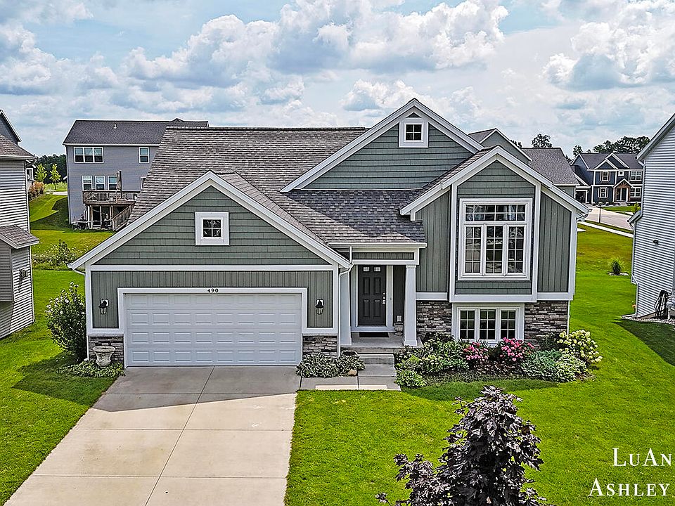 Welcome to 490 Highlander Dr, a stunning 2018-built home by Roersma Wurn builders. This spacious bi-level layout features vaulted ceilings & an open-concept living area w/a large living room & cozy gas fireplace. The modern kitchen boasts stainless steel appliances, & the dining area has a slider to a covered deck, perfect for outdoor dining. The main level includes a large primary suite, a second bedroom, & a full bath.