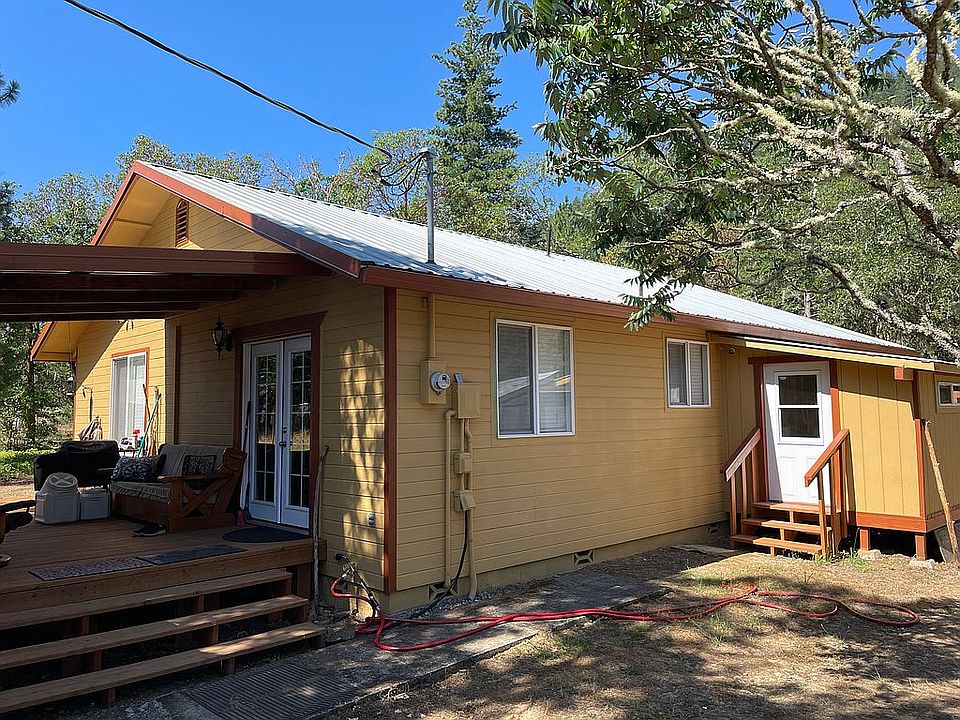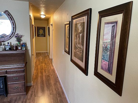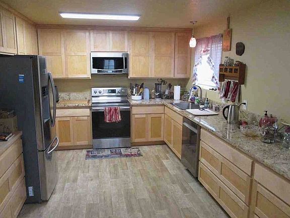 Fully remodeled interior with granite countertops and custom cabinets in the kitchen, new Samsung appliances and tile flooring. Matching tile flooring in the laundry, master and guest bathrooms. Laminate flooring throughout the rest of the home with custom trowel finished ceiling in the kitchen, hall and living room. Cozy and warm winters with an upgraded and certified wood burning stove and fully insulated house with 2x6 walls and pro-panel metal roof. New mini-split AC unit with stations in both bedrooms and living area. 120 volt base heaters in each bathroom.
