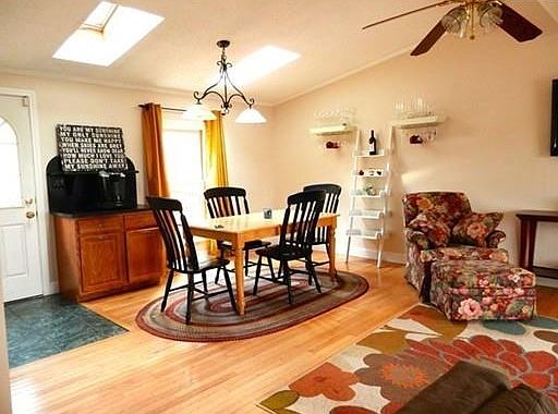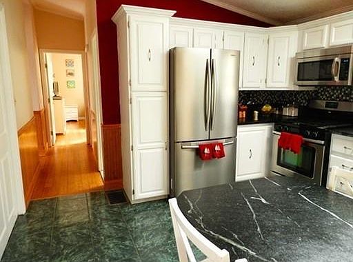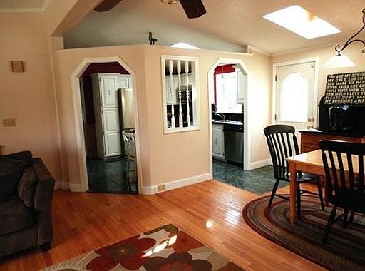 This beautifully updated split level is perfect for a family looking for space to spread out. Cathedral ceilings throughout main floor and skylights across the length of the house bring a bright and airy feel to this home. The main level includes three bedrooms with eco-friendly bamboo flooring, and two nicely updated bathrooms. The open concept living/dining room has a ceiling fan, and hardwood floors. The updated kitchen features stainless steel appliances, soapstone flooring and countertops, and a built in dining table. First floor laundry adds convenience to daily tasks. Stay cool in the summer months with central air conditioning, and extra warm in the winter with the wood stove (included). Relax on the spacious deck while pets or children play in the backyard. The lower level includes a finished mudroom with entrance from the driveway, workshop space, half bath, and a large finished room that will make a terrific playroom, family room, workout space, or home office.