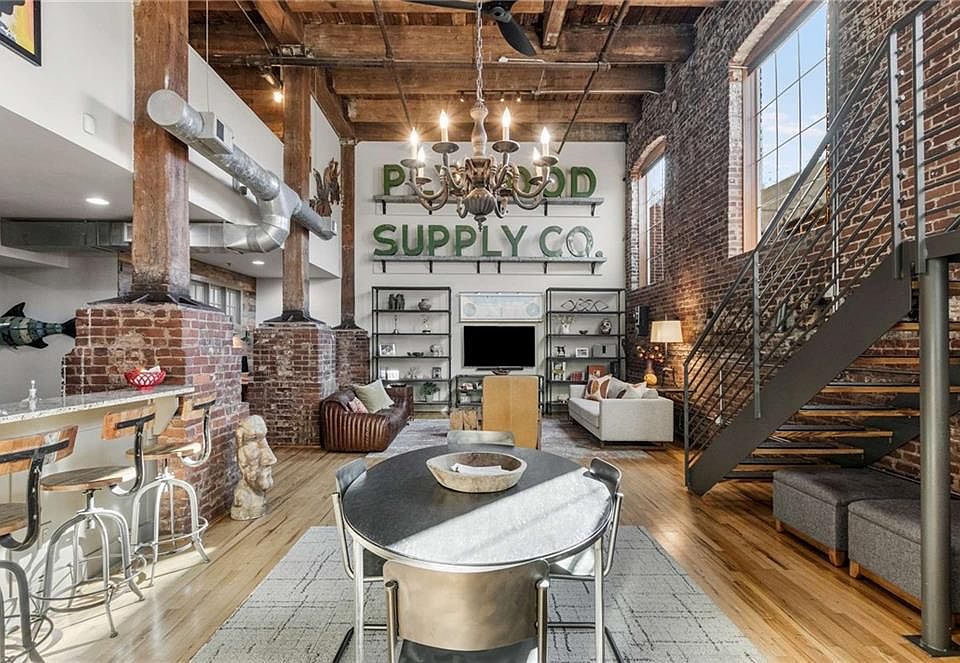 New York style loft located in the historic Gasket Lofts, where history blends seamlessly with modern luxury. This downtown building has been transformed into a collection of authentic, brick lofts, each with its own unique character. Suite 104 is a true gem, adorned with exposed brick, original wood support beams, and stunning wood ceilings. Upon entry discover oak hardwood floors throughout the loft, creating a warm and inviting ambiance. The expansive living and dining area open floor plan features soaring 20-foot wood ceilings, providing a sense of grandeur and spaciousness. Giant Pella windows fitted with motorized shades, flood the home with natural light bringing the outside in. The thoughtfully designed stylish kitchen, equipped with top-of-the-line appliances from the prestigious New Zealand brand, Fisher & Paykel DCS Professional offer both luxury and durability. Kitchen also includes a breakfast bar and spacious pantry for ample storage. Guest suite on the main and a tastefully renovated full bath create a desirable split bedroom plan for ultimate privacy. Up the industrial chic staircase - the master suite is a true sanctuary! Boasting two walk-in closets and a laundry room for ultimate convenience. Pamper yourself in the luxurious ensuite bathroom, complete with a deep-soaking tub and a separate shower. It's a space designed for serenity and relaxation. One of the few units to provide an expansive private patio perfect for relaxing or entertaining guests! The Gasket Loft rooftop deck is a real crowd pleaser offering breathtaking, unobstructed views of the surrounding area. From stunning sunsets to the impressive Midtown skyline, the iconic Mercedes Benz Stadium, and the SkyView Ferris Wheel, you'll be treated to a panoramic vista. Don't forget to catch a glimpse of the new Ga. Tech Science Square complex to the north. Parking is made easy with two assigned spaces in the gated and secured residents' lot plus guest parking just outside the gate. An unbeatable location allows for a TRUE in town lifestyle, with a short walk to Georgia Tech, Centennial Olympic Park, State Farm Arena, Mercedes Benz Stadium, the Tabernacle, the vibrant Howell Mill restaurant district and convenient access to three different MARTA lines, opening endless possibilities to explore the city. For travelers, Hartsfield airport is just a 15-minute drive away. NO whistle blow rail line requires passing trains to reduce speeds giving way to only a quiet hum of passing trains attributing to the charm and character of city living! Prepare to be captivated by this sophisticated space!