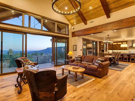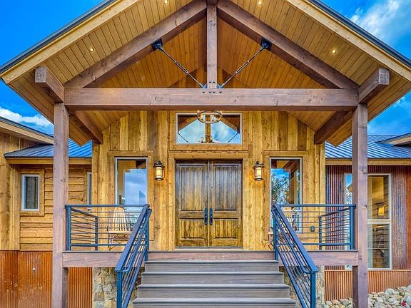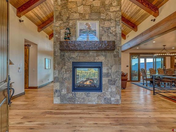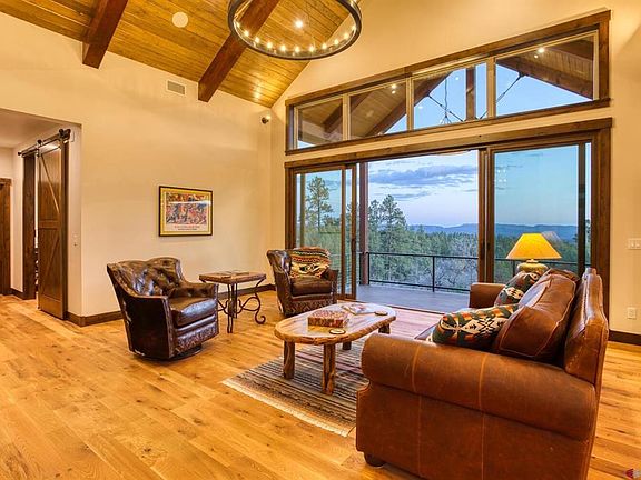 Custom designed luxury Mountain Home & Barndominium by Reynolds Ash Architects and built by Timberline Framers Inc. (TFI) Located on 35 alpine acres with four seasons of forever changing panoramic views this exquisitely designed timber frame home is ready to captivate you with its meticulous design & luxury finishes throughout. Mountain modern residence is an entertainment & family delight with warm and rich tones enhancing the open floor plan. Home consists of 4055 square feet with 4 bedrooms & 2 full baths & 2 half baths on 2 levels. It combines luxury finishes, reclaimed barn wood, stone & white oak flooring all blended for a contemporary flair. Double front door entry welcomes you with 19' cathedral style T&G & beamed ceiling & a 2-sided stand alone stone fireplace. Main level has a beautiful open floor plan, with a spacious great room, and a gourmet chef’s kitchen with the finest appliances. The main level also features a dining room which includes an open style wine bar & wine refrigerator, a private office/media room & a powder room. The primary suite with its own private balcony features 2 large walk-in closets with custom built in's, double vanities with custom cabinetry, a large wet space enclosure with a 5 foot soaking tub and multi-head shower creating the perfect personal spa to relax and enjoy each morning or evening. Great room transitions seamlessly to a 14 foot covered balcony with a 6 person teak dining table, an outdoor stone fireplace and a built in gas grill. There is also a large laundry room, and mudroom off the kitchen connecting to the attached 2 car garage with full epoxy floors. Attic extension is ready for new owner to complete to their own personal preferences. Room has electricity, a window and is fully insulated. Downstairs is a large entertainment area and game room with a walk-in bar with a 42" high Chinese elm live edge counter top, custom cabinetry, a refrigerator & icemaker, 3 bedrooms, a powder room & full extension sliding doors opening to the large covered patio & flagstone covered walkway leading to a large gas firepit and a Bullfrog 6 person hot tub. At night you will be captivated by the expansive Colorado sky & clear starry nights. The entire envelope of the home is fully insulated with closed cell foam exceeding building requirements. Structural landscaping with heavy rock around the home for drainage. There is efficient In floor radiant heat & air conditioning. The entire home Has full security & is wired for sound including outdoor balconies & patios. Siding is corrugated steel, native stone & live edge cedar. The detached barndominium is similar in design and finishes. Living area is 1150 square feet with an attached heated 1600 square foot garage, shop, barn, or gym and has its own 1/2 bath. Full kitchen w/walk in pantry, full bath, stackable full size washer & dryer, & a loft bedroom with a walk in closet. Nice size private & outdoor covered patio. Alpine Lakes Ranch HOA provides year round road maintenance. All utilities including metered central water are underground. Home is approximately 25 miles from downtown Pagosa Springs, restaurants, hospital, hot springs & world Class Fishing and Skiing.