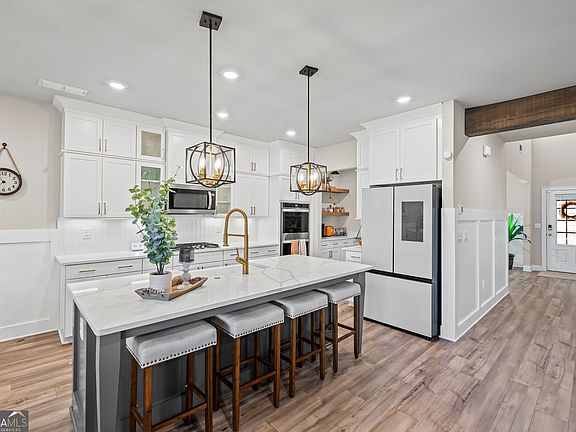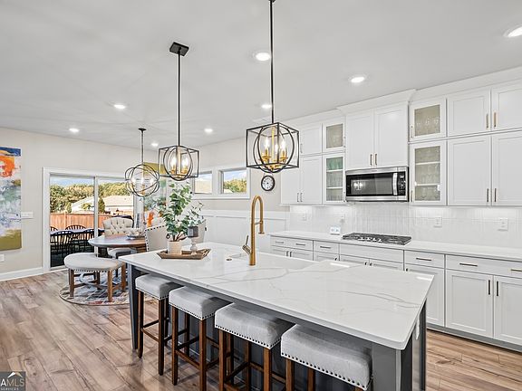 Welcome to modern elegance in the heart of Woodstock's sought-after Riverside Estates neighborhood. This beautifully crafted home showcases timeless hardwood floors and an open, thoughtfully designed floorplan that blends sophistication with everyday comfort. The family room is bright and inviting, featuring a classic brick fireplace framed by custom hardwood floating shelves and abundant natural light. The open layout connects seamlessly to the kitchen and breakfast area, creating a spacious and welcoming environment perfect for both daily living and entertaining. The chef's kitchen is a showpiece with quartz countertops, stainless steel appliances, an expansive island, and a walk-in pantry. A newly added coffee bar enhances both style and convenience, offering the perfect spot to start your day or entertain guests. The adjoining breakfast area opens directly to the patio and fenced backyard, ideal for outdoor dining and relaxation. A separate dining room provides an elegant setting for hosting dinners and special occasions, blending formal charm with the home's modern design. A striking accent wall along the staircase adds architectural interest and connects the main and upper levels with thoughtful detail. Upstairs, a versatile open area provides flexible space for a second living room, playroom, or home office. The primary suite offers a serene retreat with a luxurious ensuite bath and spacious walk-in closet. Set within the friendly Riverside Estates community, this home offers the perfect balance of tranquility and convenience. Enjoy close proximity to top-rated schools, parks, shopping, and dining in vibrant downtown Woodstock. 490 Payne Rd blends contemporary finishes, open-concept living, and designer touches throughout, creating a home that feels both refined and welcoming.