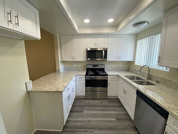 $1000 OFF FIRST MONTH'S RENT! Canyon Rim Villas: Updated Upper: 3 Bedroom 2 Bath Condo, Kitchen with White Shaker Cabinets, Granite Counter Tops, Stainless-Steel Appliances, Stove, Dishwasher, Microwave Hood, Separate Dining, Ceiling Fan, Carpet and Vinyl Planking throughout, Recessed Lighting, Bathroom Vanities with Granite Countertops, Vertical Blinds, A/C, Laundry Hook-Ups (Stackable), Balcony with Storage, 1 Assign Parking Space, Community Pool, Spa, Near Golf Course, School, Parks, and Shops. PET: NO