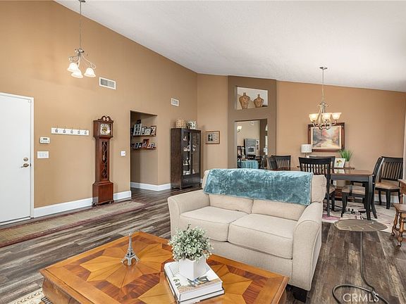 Located on a quiet cul-de-sac in sought after Sun Lakes Country Club, you will find this beautiful home. This very popular floor-plan features 3 bedrooms, 2 bath, a spacious living room and formal dining room, all in tasteful colors. The gorgeous remodeled kitchen sparks with stainless steel appliances that set off the stunning granite counter tops, and the painted cabinets with pull-out drawers add functionality that most homeowners are looking for. Just off the kitchen is the cozy family room with a gas fireplace and French doors that lead to the patio area. The two guest bedrooms featured in this lovely home are an added bonus and can be used for guest, an office or a den. Step into the primary bedroom and the wonderful accent wall of shiplap becomes the focal point of the room along with the French doors. The primary attached bathroom has been tastefully updated with granite counter tops and an elegant shower. The spacious backyard has a sense of privacy from your neighbors, mountain views and a aluma-wood patio cover. An attached 2 car garage has a pull-down ladder for easy access to the attic for storage and there is a tankless water heater for energy efficiency. The stunning sturdy vinyl flooring runs through-out the home and adds a contemporary feel. Sun Lakes Country Club is truly one of the most affordable 55+ communities in Southern California, come see for yourself!