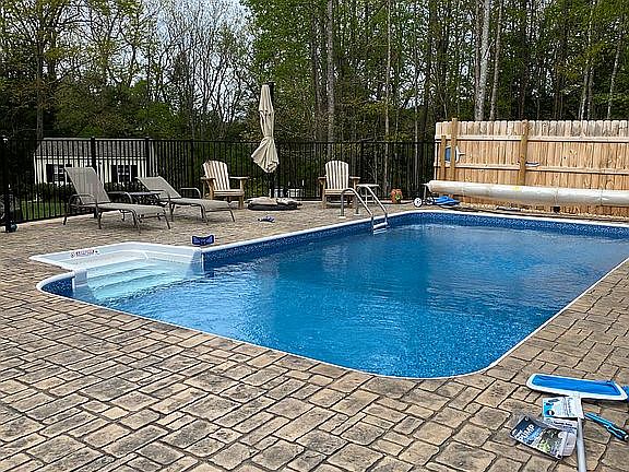 Traditional two story with wonderful fenced in yard, sunny rooms, great pool and outdoor area. Kitchen is spacious with lots of storage and counter space.