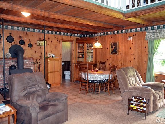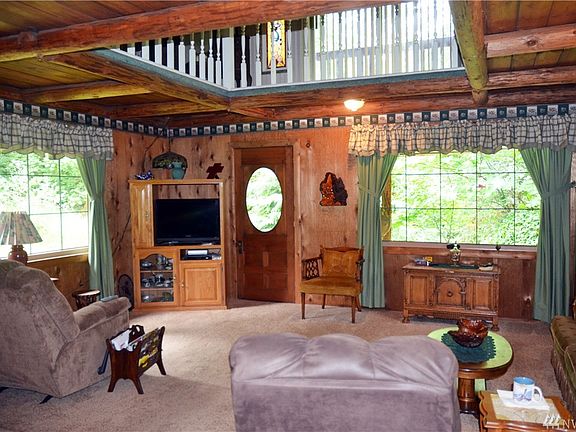 This 2 bedroom 1.5 bath cabin, on 5 acres, is situated on the banks of Dry Bed Creek. The home is super cozy and makes you feel right at home when you walk in the door. The living room is open clear to the ceiling of the second floor and the master bedroom upstairs over looks the living room with a walkway that circles the living room. Ceiling is covered with antique finishes & stained glass windows. Barn. Shop. Grove of Cedar Trees across creek. Antique wood cook stove. Tin tile from the 1890s.