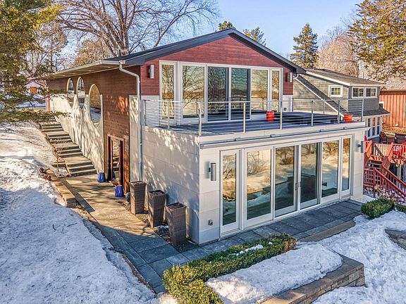 Stunning modern home located on Harrison Bay. Extensive remodel in 2010. Enjoy year-round sunset views. One-of-a-kind Master Bath glass shower, overlooking the bay. Your next home includes full automation including blinds, lighting, Bowers & Wilkins sound system, climate control, and fireplace via custom-installed Crestron home automation system. With Minnesota winters, you will appreciate heated floors throughout the home with multi-zone controls, including the garage. Natural light floods the home throughout the day with 6’ & 7’ tall circular windows on the East and wall-to-wall, floor-to-ceiling windows in Owner's Suite and main living area to the lake. Enjoy over 700 sq ft of outdoor living space or enjoy a late-night bonfire, 10’ from the lakeshore in a separate firepit area. With the majority of the home being maintenance-free including metal roof and custom-made galvanized steel siding, you will be able to maximize your time on the lake! Hard, sandy bottom lakeshore with riprap.